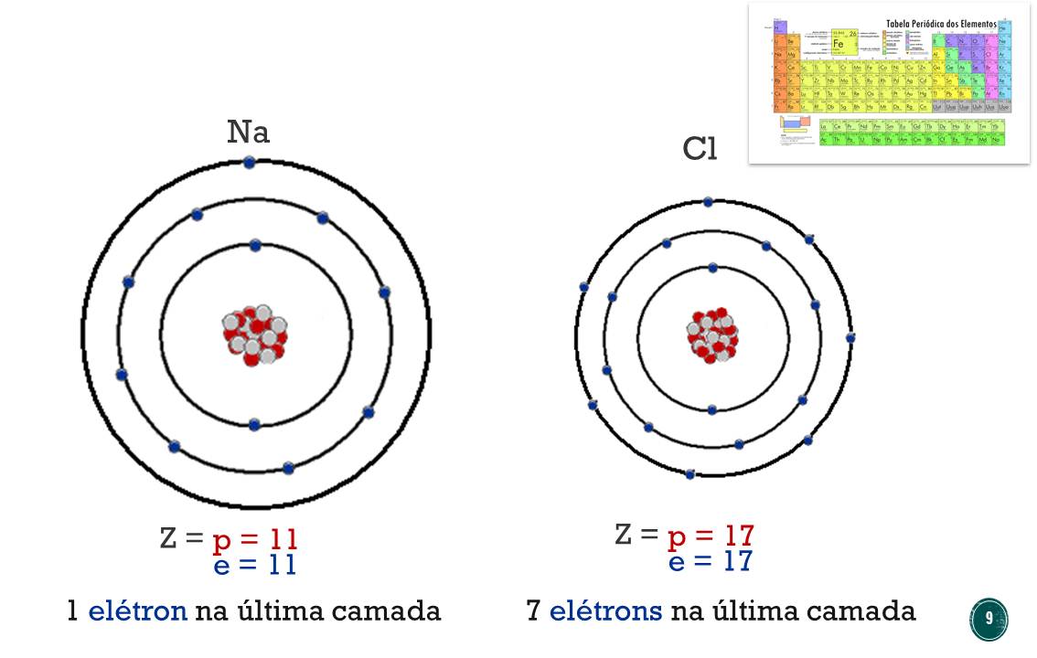Dessa forma, o átomo de cloro ganha esse 1 elétron, se tornando Cl- e ficando maior devido às repulsões eletrônicas. O sódio, por sua vez, fica menor por ter perdido esse elétron da última camada ao se tornar Na+.