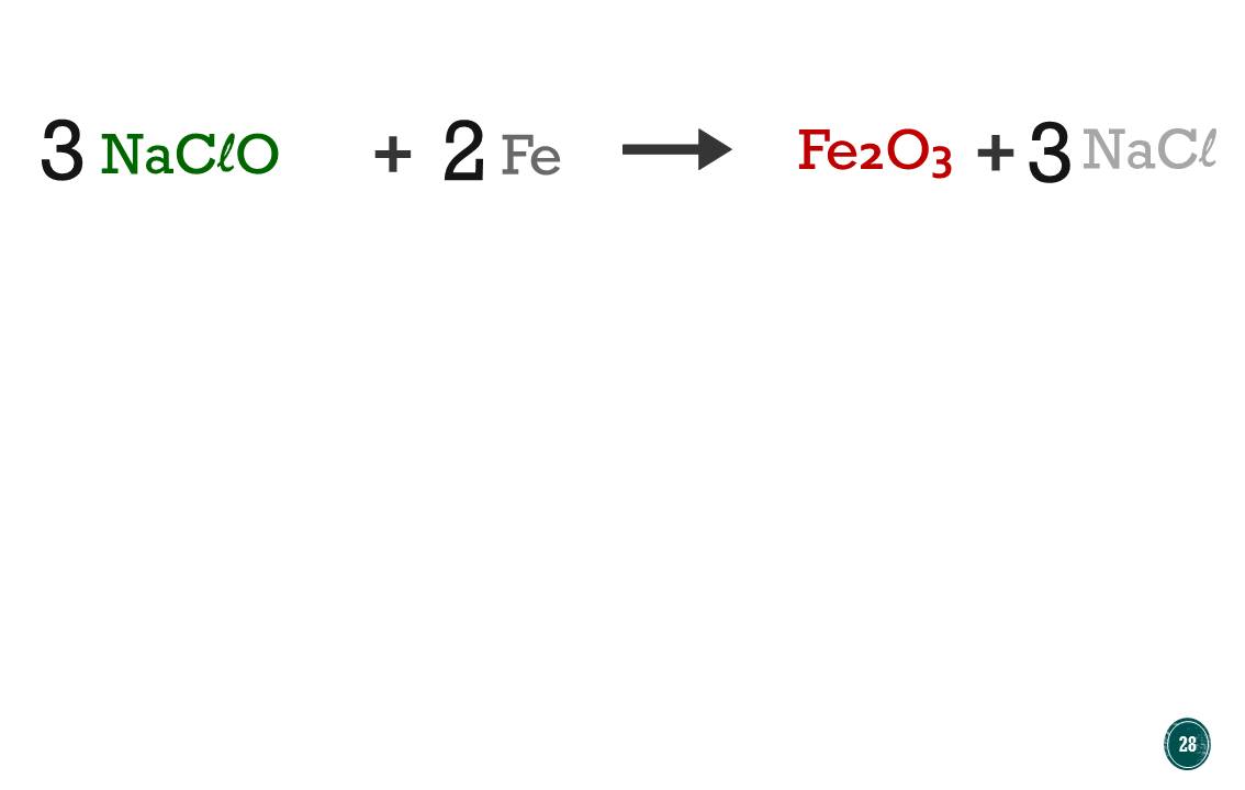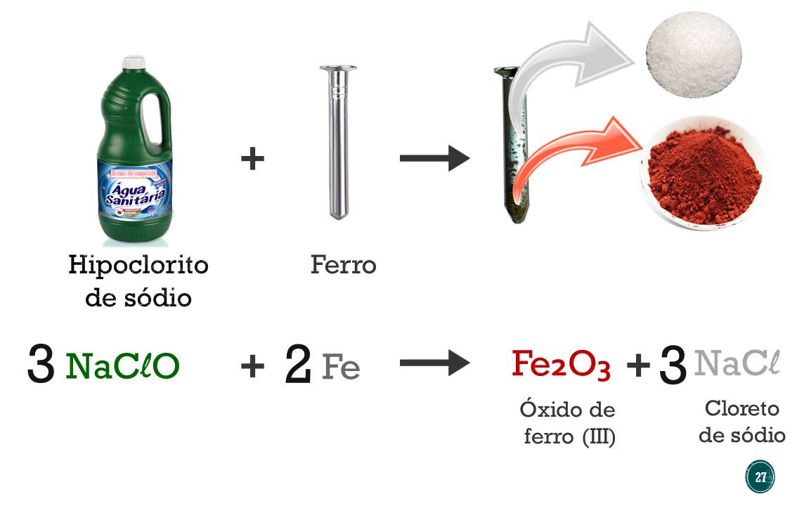 Sendo assim, se você quiser, pode trabalhar com os estudantes as duas reações de oxirredução, a que foi mostrada anteriormente entre Fe e O2 e a reação do Fe com o NaClO presente no hipoclorito. Essa segunda reação é apresentada nos slides a seguir.