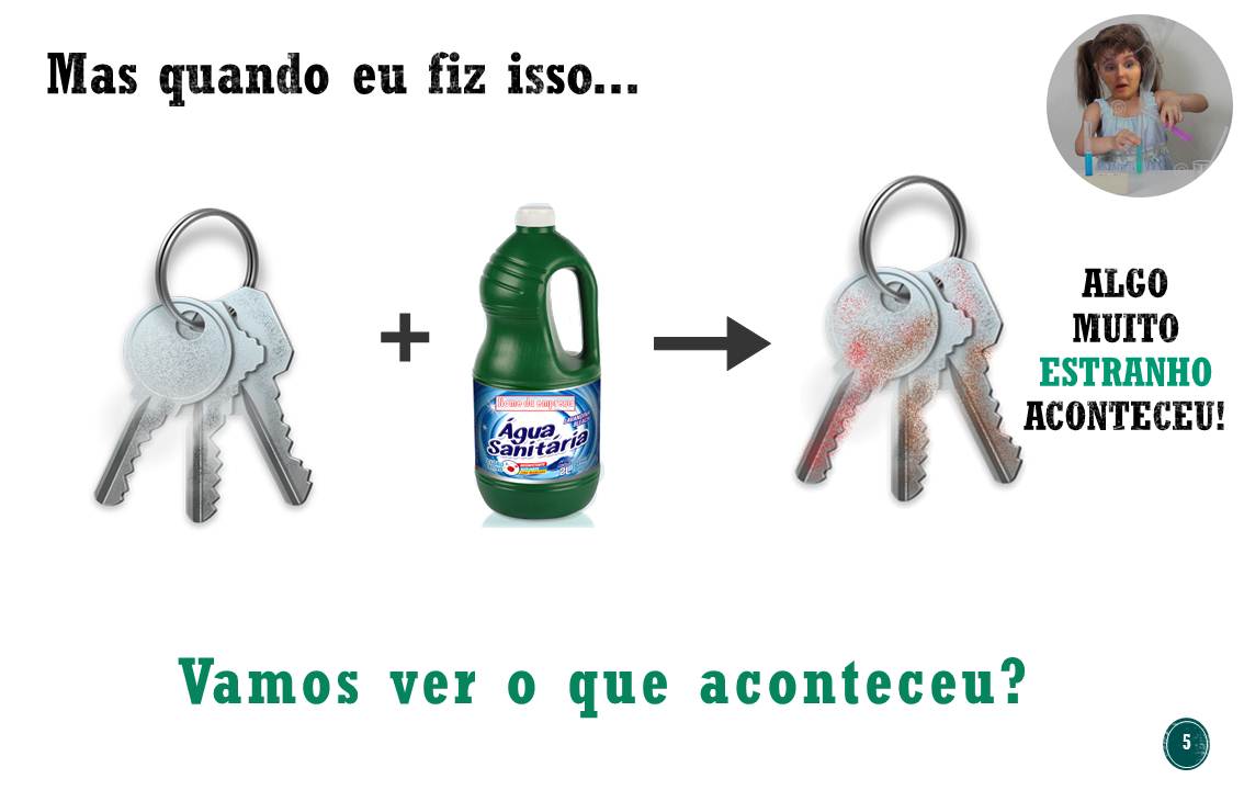 Então, após apresentar esse problema, nós e a turma vamos tentar entender o que aconteceu! Por que será que a água sanitária, que tudo limpa, sujou minhas chaves?