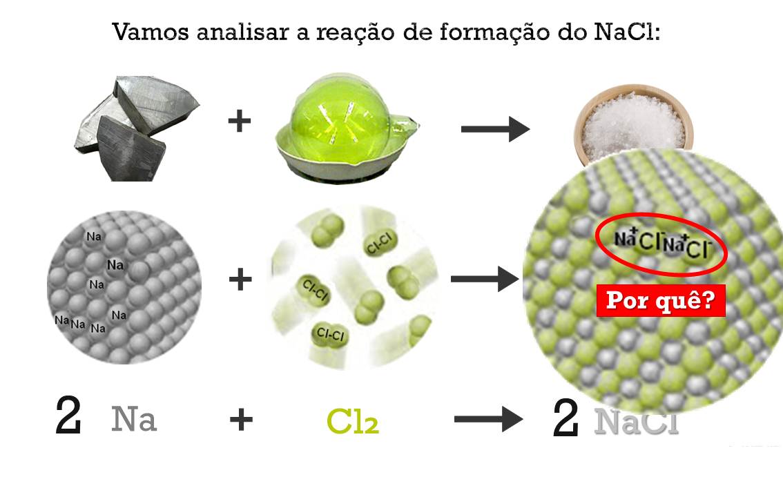 Só que antes de conseguirmos entender isso, precisamos ver como os átomos geralmente se comportam nas reações químicas através de um exemplo mais simples. Para isso, vamos utilizar a reação de formação do NaCl como exemplo.
